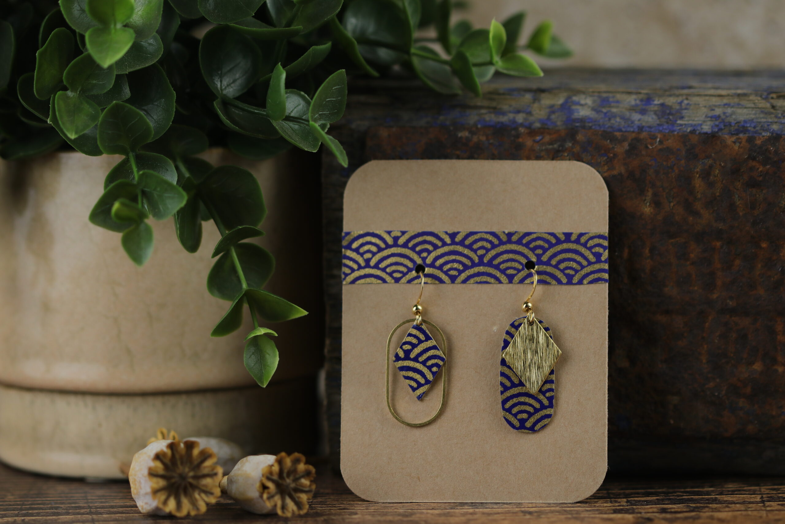 Je travaille le papier washi, que j’associe au laiton, et j’utilise des crochets en acier inoxydable anti allergène, choisis pour leur confort au quotidien, y compris sur des oreilles sensibles.