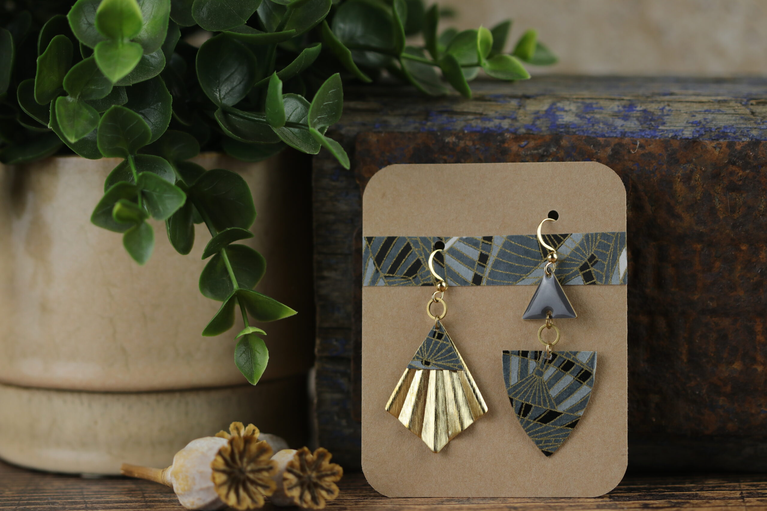 Je travaille le papier washi, que j’associe au laiton, et j’utilise des crochets en acier inoxydable anti allergène, choisis pour leur confort au quotidien, y compris sur des oreilles sensibles.