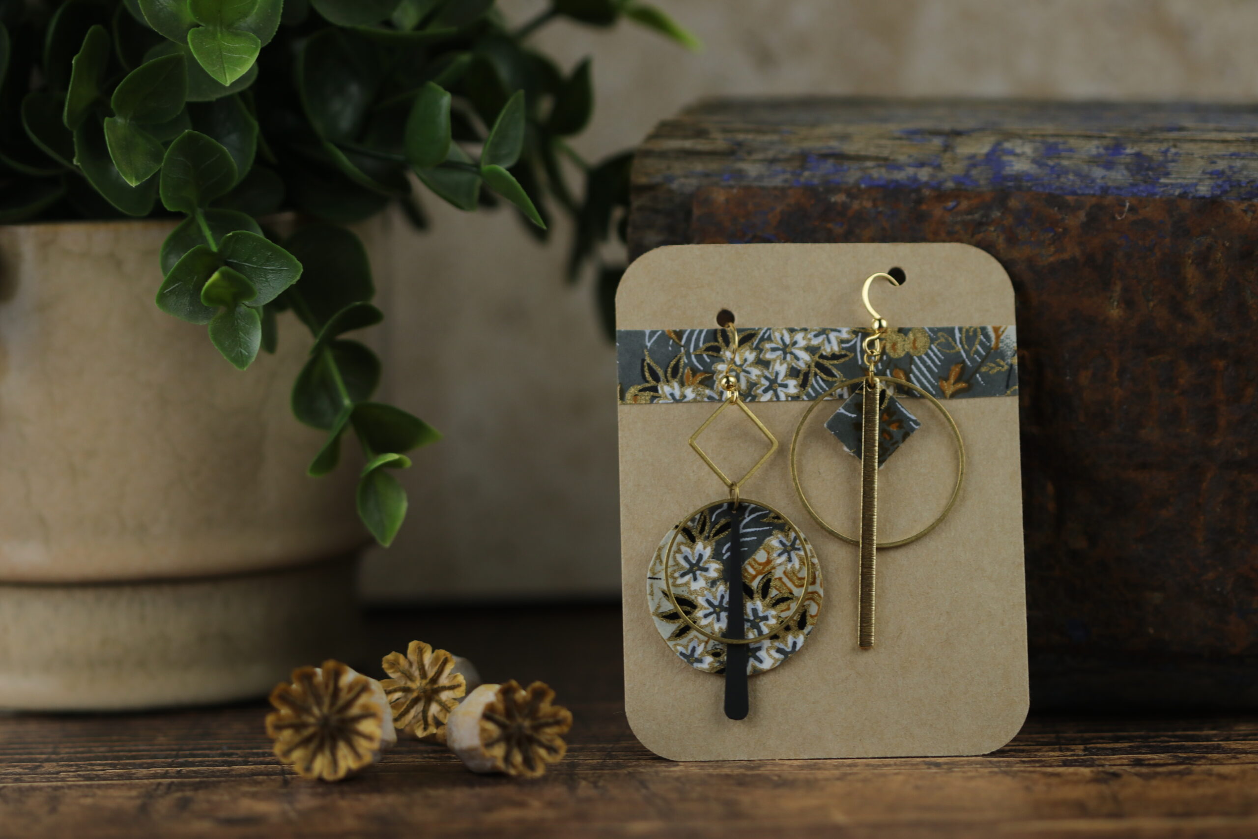 Je travaille le papier washi, que j’associe au laiton, et j’utilise des crochets en acier inoxydable anti allergène, choisis pour leur confort au quotidien, y compris sur des oreilles sensibles.